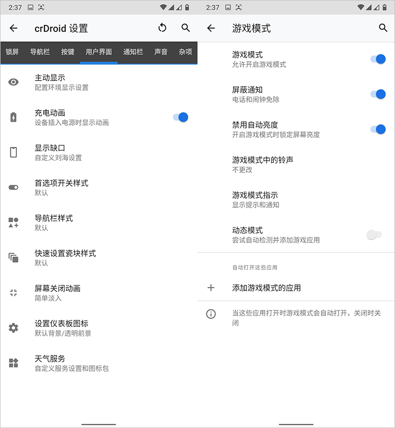 自定义功能太多就没法全部介绍了,值得一提的是游戏模式功能,可以添加游戏到这个模式里面,避免游戏过程中被消息通知、来电等打扰,同时你也可以添加其它应用,还是蛮不错的。