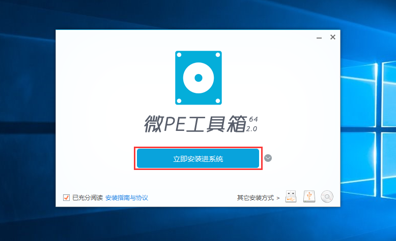 1、首先我们要下载好需要使用的主角 微PE工具箱 下载完成后运行程序,点击立即安装进系统。