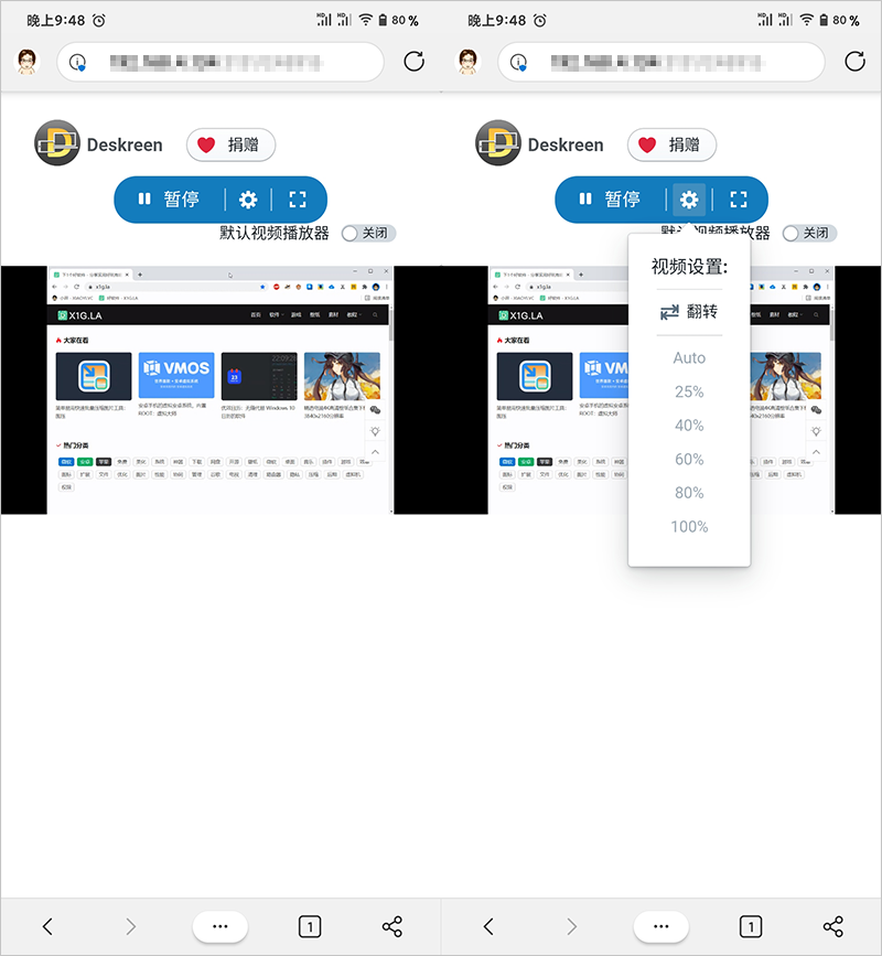 然后在手机上就可以看到共享的软件窗口软件了,功能上支持全屏、视频设置,调整大小和翻转,因为在同个局域网里面,屏幕同步基本没延迟。