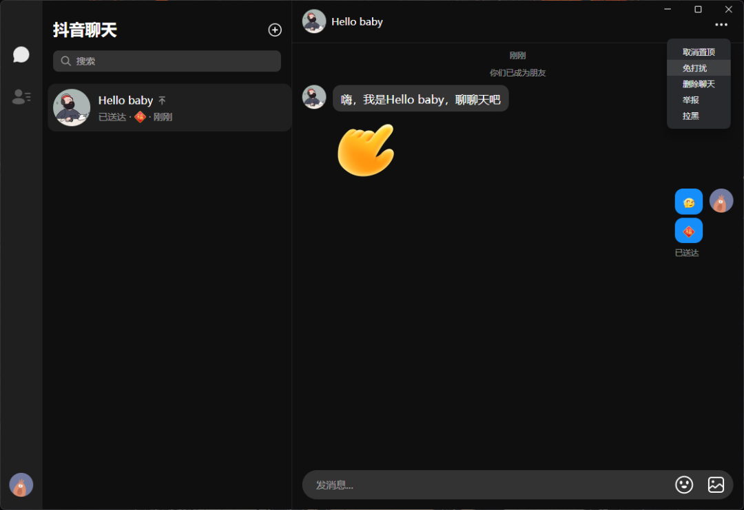 聊天界面方面,功能支持发送表情和图片,暂不支持发送文件。其它功能方面支持置顶、免打扰、删除聊天、举报、拉黑。