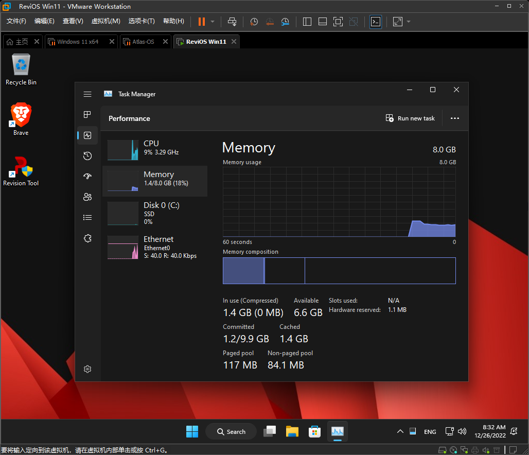 开机内存占用 1.6 GB 左右,进程数量 26 个,对比原版算优化的不错了,并且还保留了打印服务、游戏商店等功能。