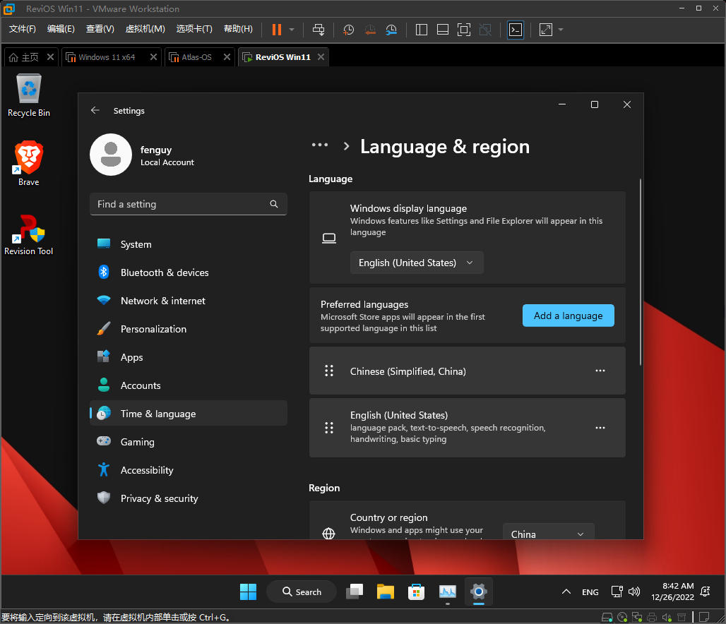 这个「ReviOS」系统默认是英文语言的,不过好在是可以顺利添加中文语言包,这样其它软件也不会出现乱码了。