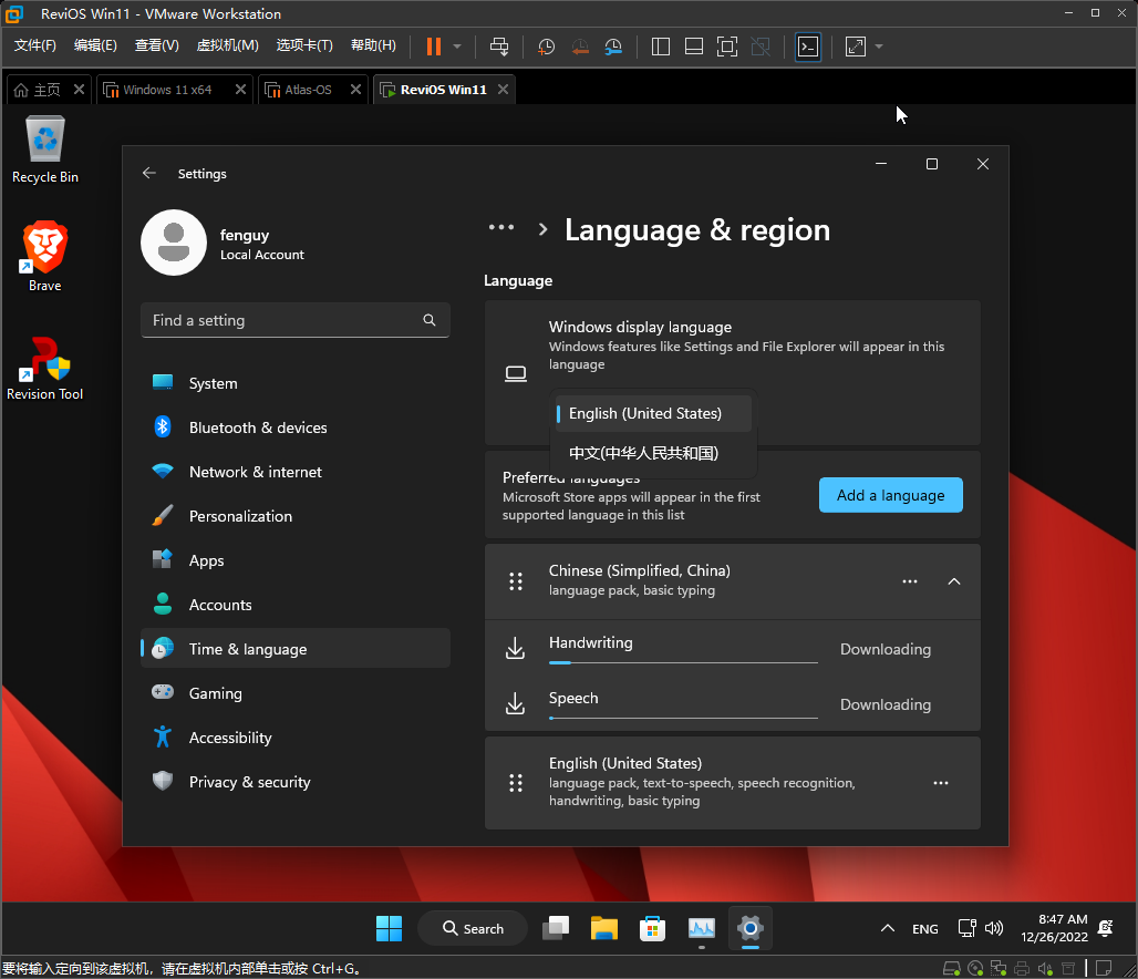 下载好后,Language & region – Windows display Language – 选择中文,之后注销或者重启系统生效。