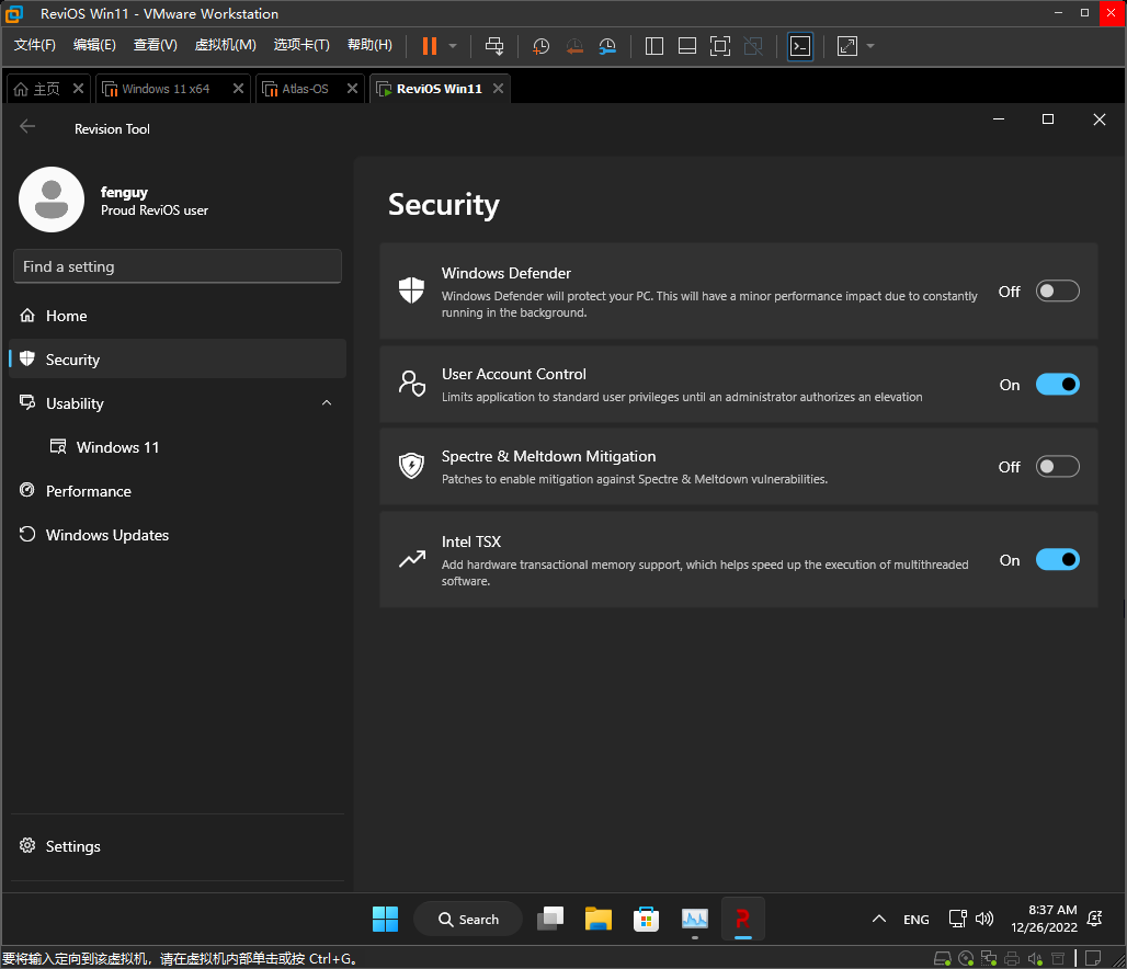 内置了 Revision Tool 工具,提供一键开启关闭自带杀毒软件、用户账户控制、Intel TSX 指令开关、以及性能优化、系统更新设置等功能。