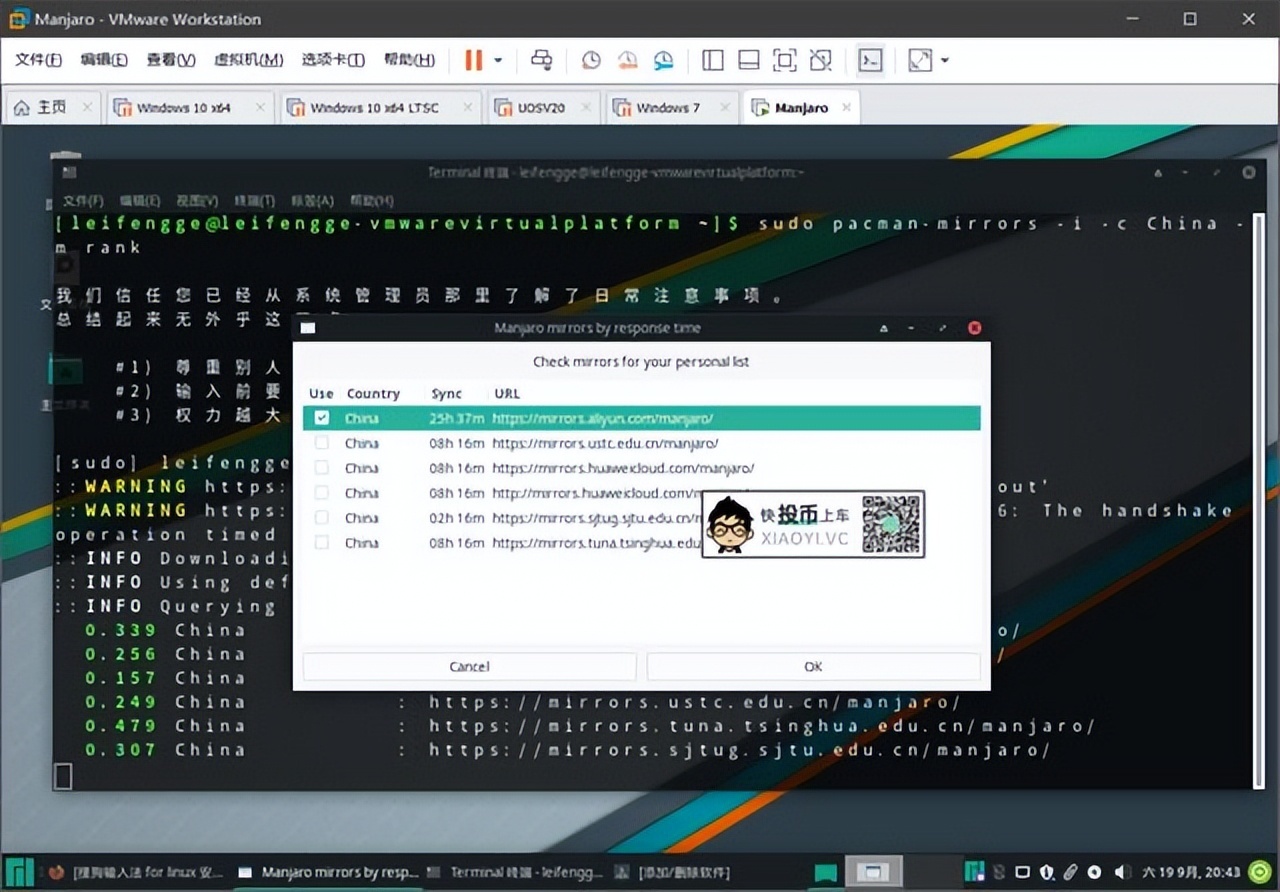 为方便「Manjaro」安装软件,需修改成国内源地址,在终端里面输入命令: