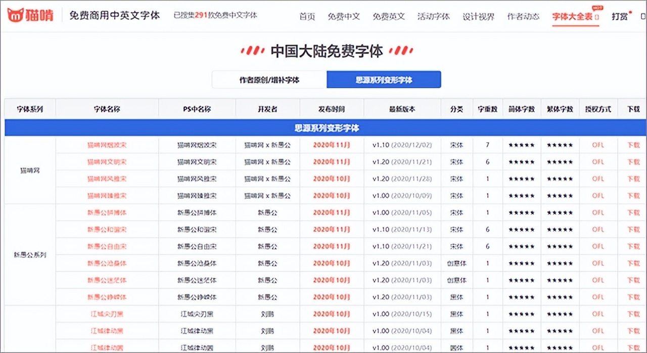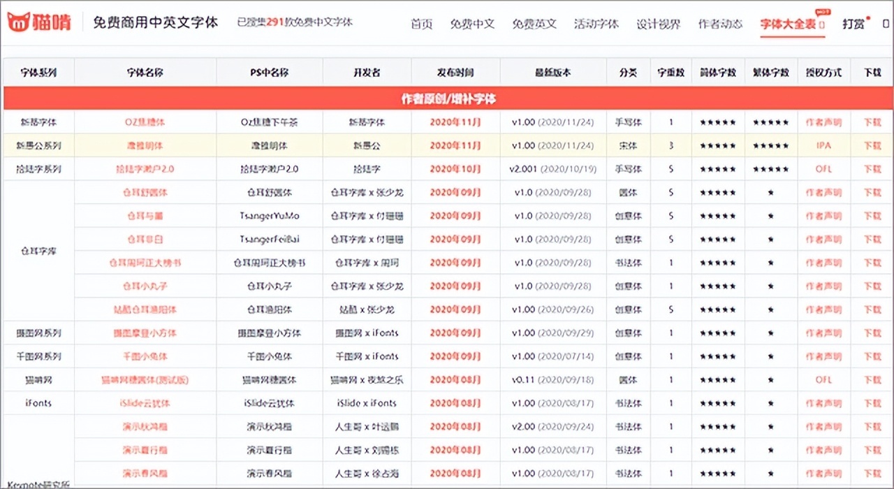 这个「猫啃」网站收录了免费中文、免费英文、活动字体,并且每个字体的免费授权方式、声明、来源都注明的清清楚楚,可以避免你一不小心用到商业字体。
