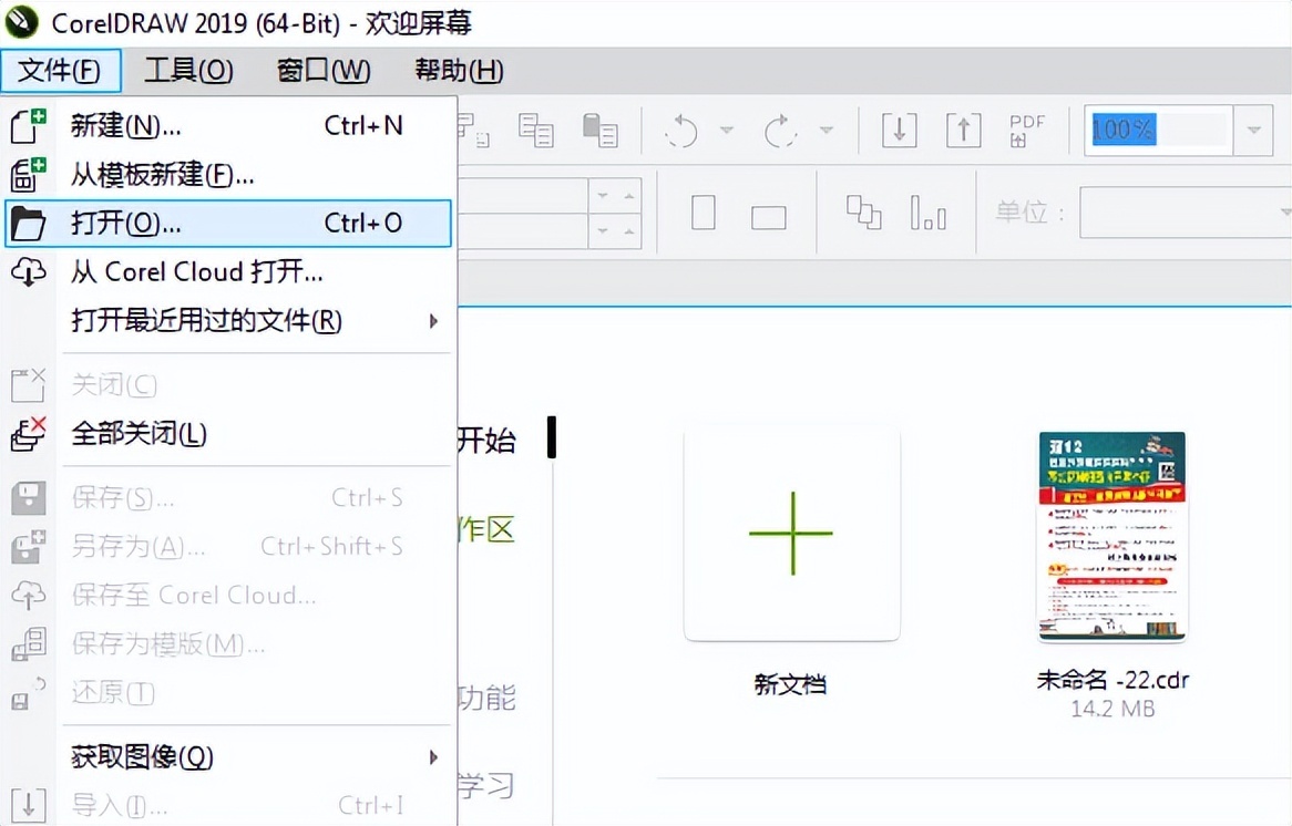 打开CorelDRAW的软件,执行菜单栏中的文件—打开,或者直接使用快捷键Ctrl+O,如下图所示。