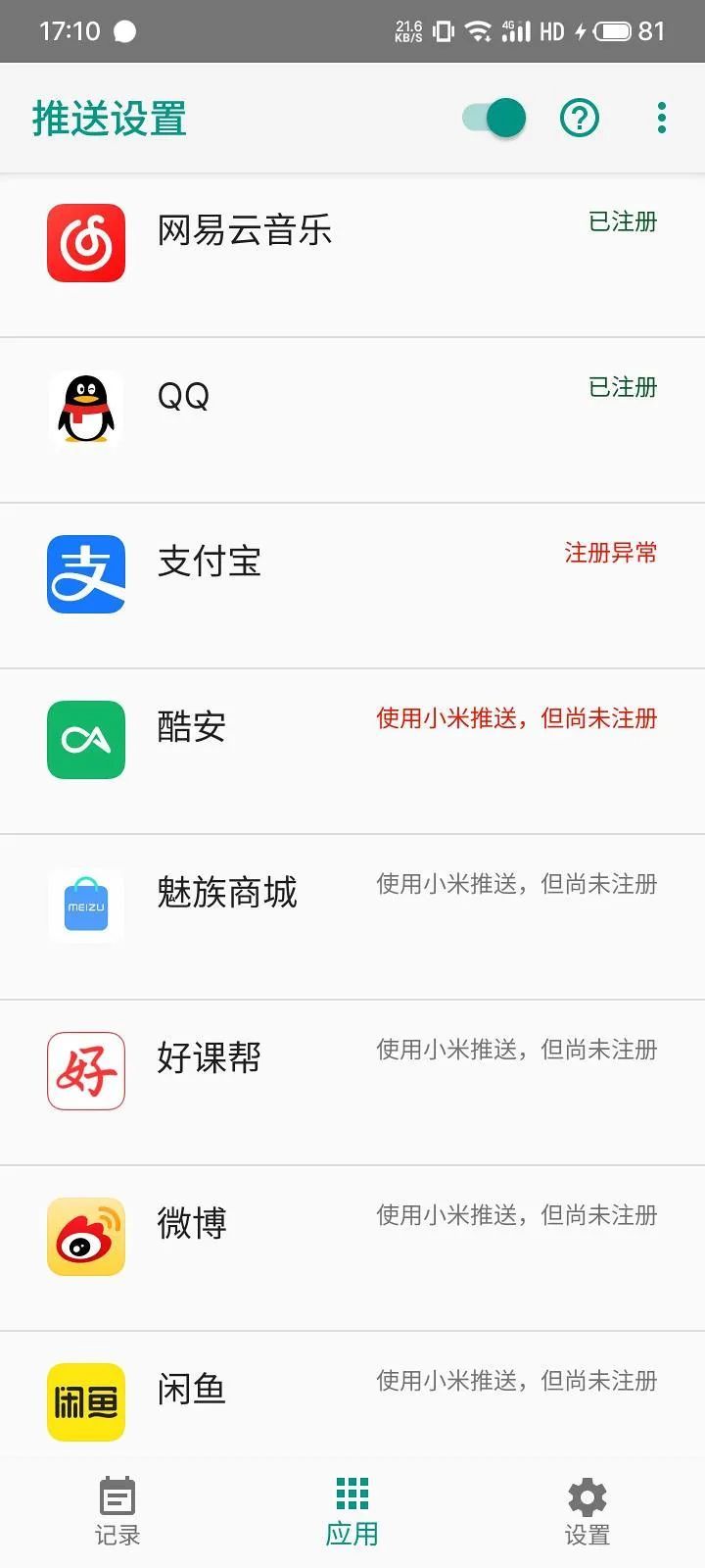 除了小米 MiPush 消息推送还可以选择华为的 PUSH 推送服务,同样常用的应用基本都接入支持了。