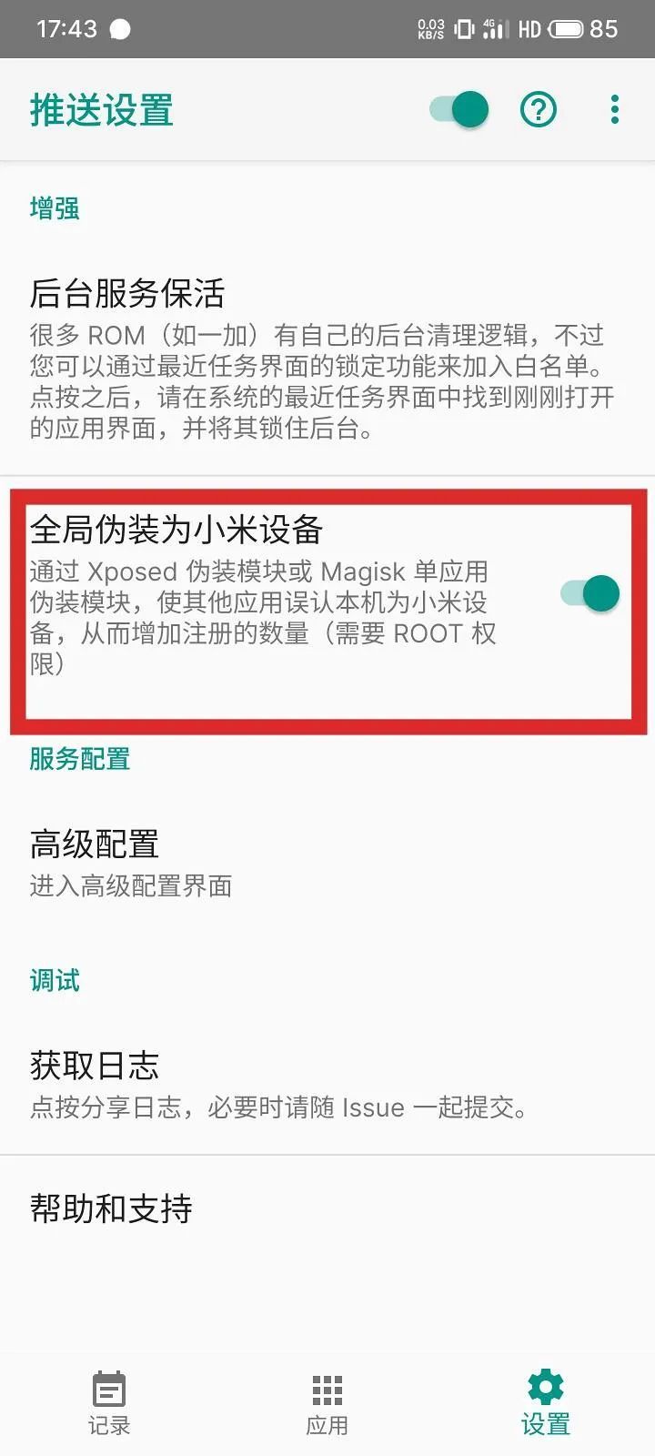 1.安装 manager.apk 和 xmsf_service.apk 后打开桌面新出现的”小米推送服务”,根据提示取消电池优化和打开状态权限,然后打开设置里面的全局伪装为小米设备选项。