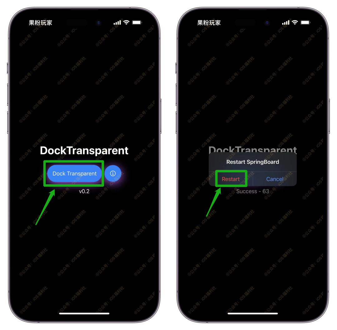 安装说明:在线安装或者自签安装好APP(DockTransparent),直接打开,如下图点击:Dock Transparent ,会有弹窗,然后点击Restart,手机会自动注销然后成功。