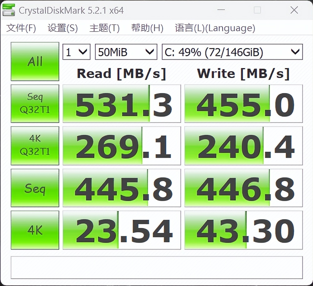 速度测试方面,在没有开启 ASUS RAMCache 缓存的情况下,锋哥的辣鸡固态硬盘读写速度在读:531 MB/s,写 455 MB/s 左右。