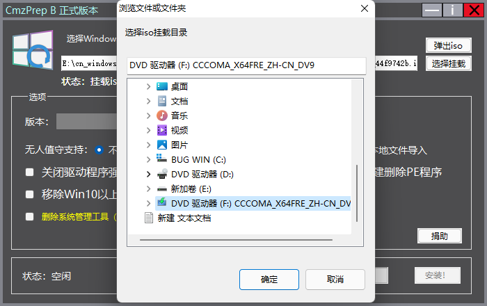 选择你的系统镜像,镜像格式支持 iSO/WIM/ESD。注意,镜像路径不要出现中文或特殊符,然后挂载,选择系统的驱动器目录。