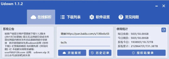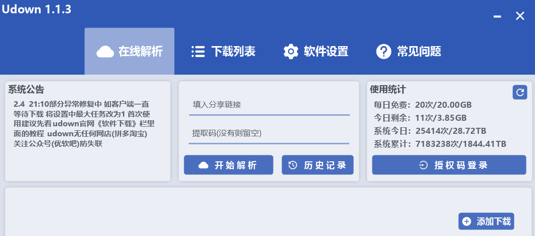 Udown 网页或者客户端都是可以免费使用,但有一定限制,每台电脑每日免费: 20 次解析/20 GB 下载容量。根据了解,在此之前,每台电脑每日还是 50 次解析/50 GB 下载容量,可能使用人数多了,开发者把规则修改了。