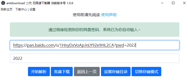 使用方法也非常简单,下载压缩包,解压直接运行 antdownload.exe 打开,然后还是复制粘贴网盘分享链接,点击开始解析。