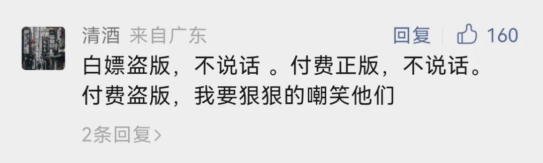 正如粉丝“清酒”留言所说:“白嫖盗版,不说话 。付费正版,不说话。付费盗版,我要狠狠的嘲笑他们”