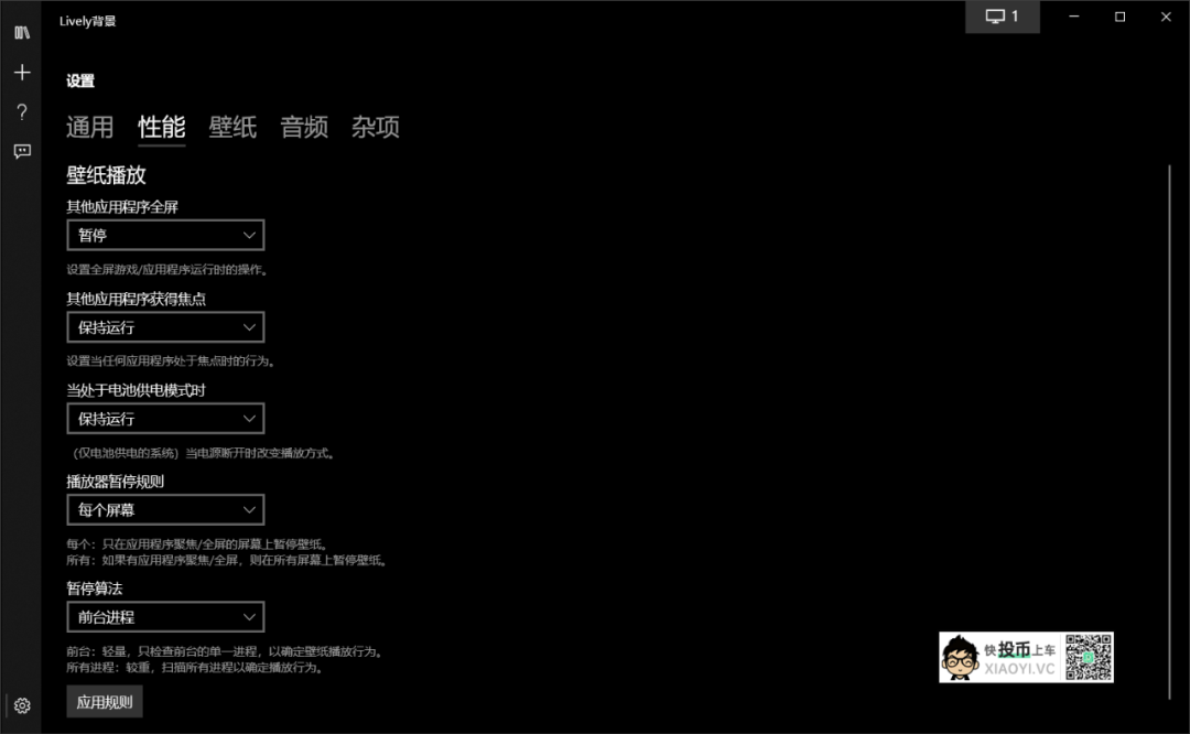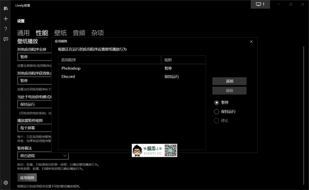 还支持设定应用规则,例如当你运行大型软件、大型游戏时,可以自动停止动态壁纸,避免占用资源,影响软件、游戏运行性能。