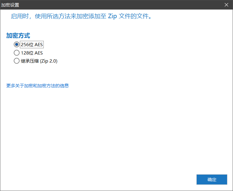 压缩文件支持强大的 128 位和 256 位 AES 加密算法,可以避免你重要的压缩包被别人解密。