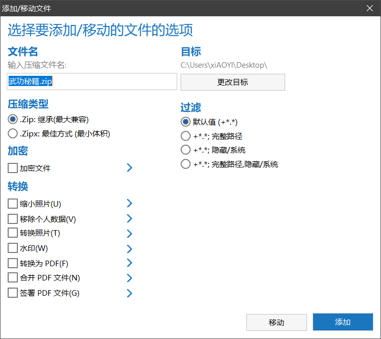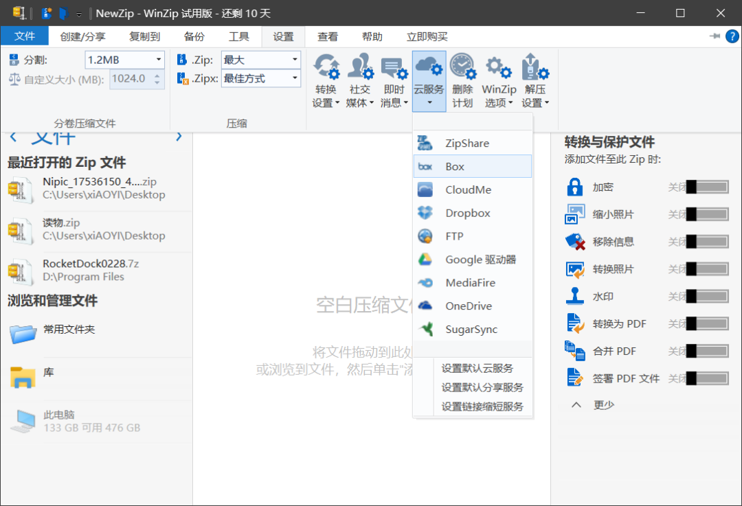 支持云服务功能,可以把登陆 FTP、OneDrive、GoogleDrive 等,支持把文件压缩后直接上传到网盘/服务器里面。
