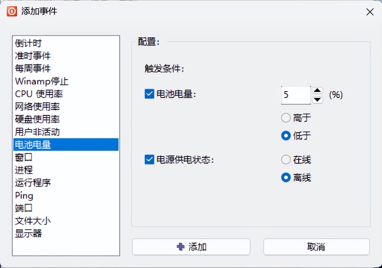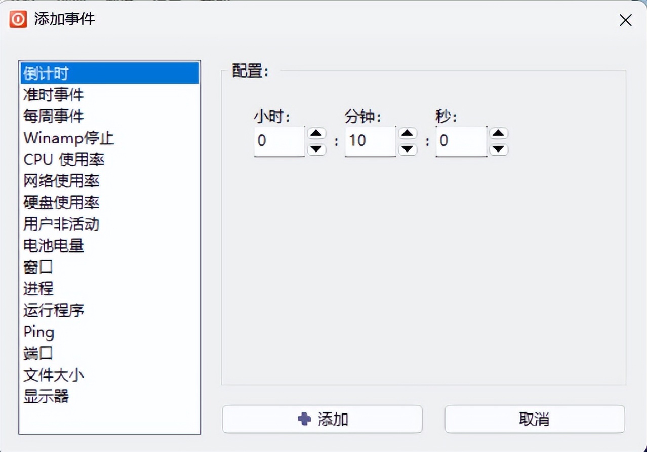 首先第一步添加事件,也就是设置触发自动任务开始执行的条件,可以设置倒计时多久、准时时间几点几分、CPU 使用率达到多少、电池电量达到多少、运行某个程序等等。