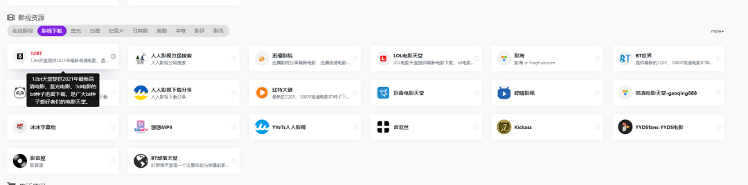 每一个板块分类也非常细致,比如影视板块中你不光可以看到哪些站点可以在线观看,甚至还可以看到哪些网站可以在线下载、蓝光下载、影评、字幕、影讯等具体分类。