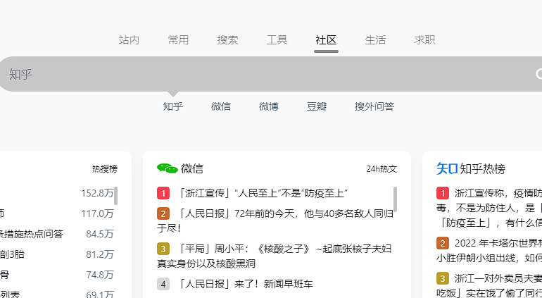 还可以通过上方菜单在某些大型社区上搜索,比如某宝、某信、某乎、豆瓣等等,没有任何搜索规则。下方便是热榜聚合,你可以实时了解最热门的的资讯。