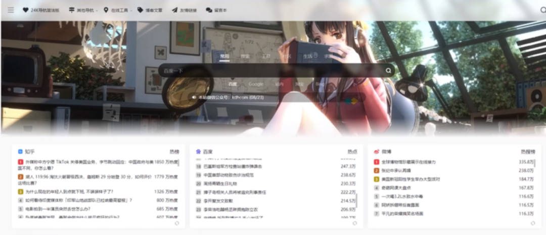 第一次进入网站会加载比较长的时间,进入网站后首先映入眼帘的便是标准的搜索引擎,不过 24k 网站上的自定义搜索程度非常高,可任意选择主流的搜索引擎进行切换。