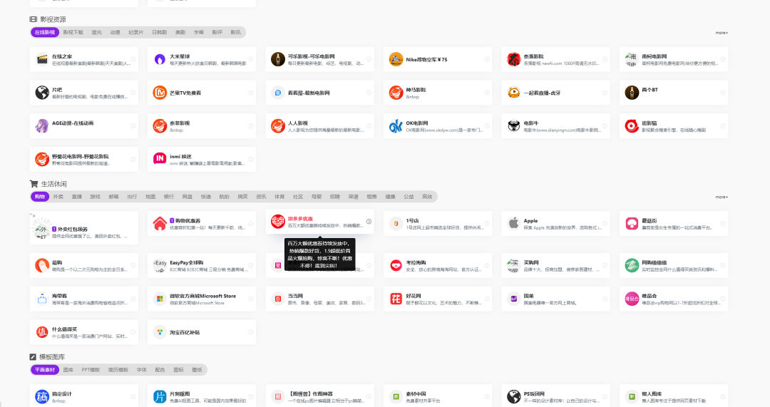 什么在线影视、读书、购物、资源搜索、软件/插件下载、媒体运营、便捷工具等数十个板块,你所需要的东西这里都有。