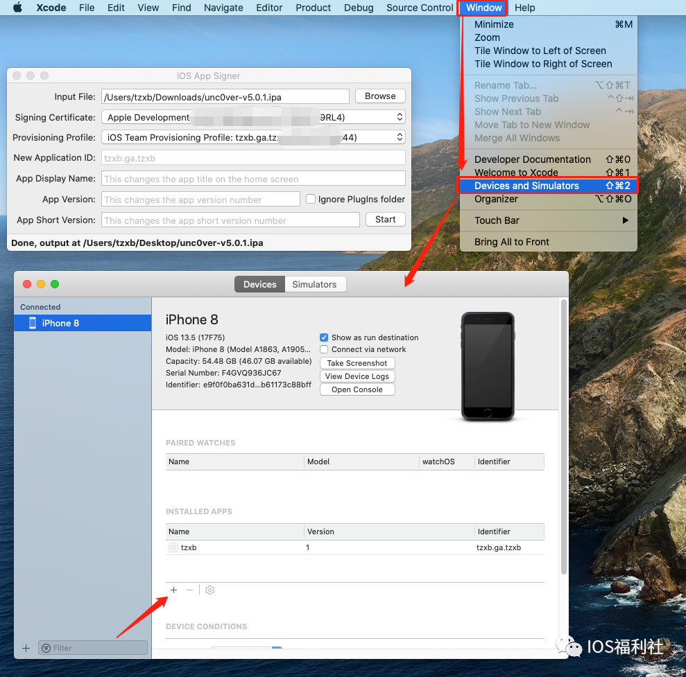 回到 Xcode 点击上方的 Window 点击 Devices and Simulators,会弹出安装界面,如图点击下面的+号,添加刚刚签名成功的un5.01,稍等就会安装成功,手机就会出现UN的图标,然后通用-描述文件-信任开发者证书即可享用了!