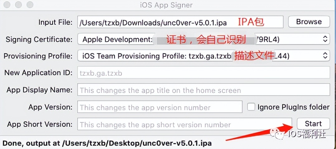 如图,选择要签名的IPA包(以un5.01为例)和自己的证书,及配置好刚才提取的描述文件,最后点击Start ,然后会弹窗,要你选择保存签名好IPA包的地方,再输入Mac开机解锁密码,这时un5.01就签名好了!