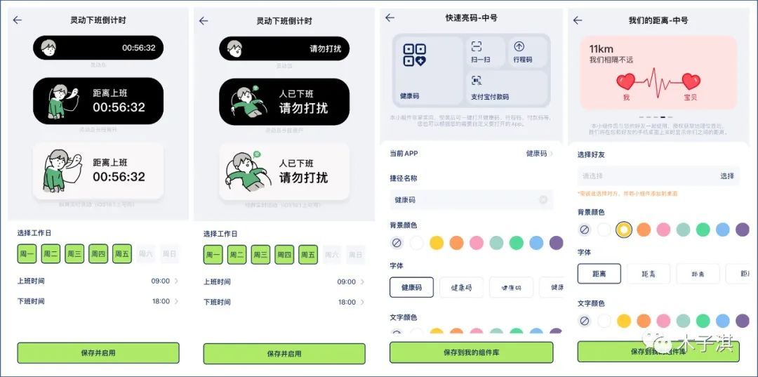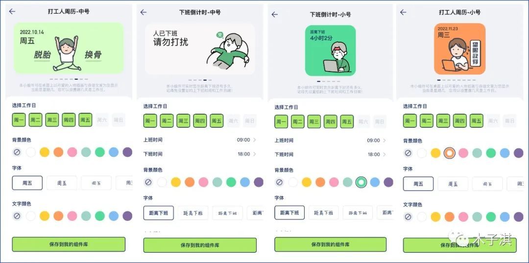 下班倒计时小组件支持 5 种展示样式,可以设置工作日、上班时间、下班时间、背景颜色、文字颜色、字体。