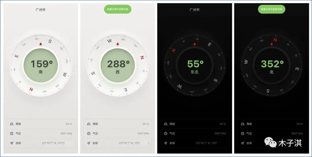 它完全免费,如一股清流,极简优雅,唯美清新,干净清爽,简单好用;它支持离线使用,支持深色模式,支持获取并展示当前位置的海拔、气压、详细的经纬度信息,还支持辨别方向。