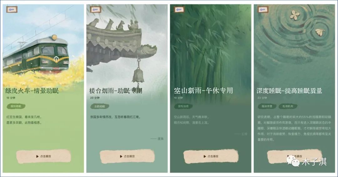 深度放松包括:楼台烟雨助眠专用、绿皮火车情景助眠、空山煮茶安神助眠、南屏晚钟静心专用、暗雨打窗解压放松、空山新雨午休专用、秋日小调专注学习。