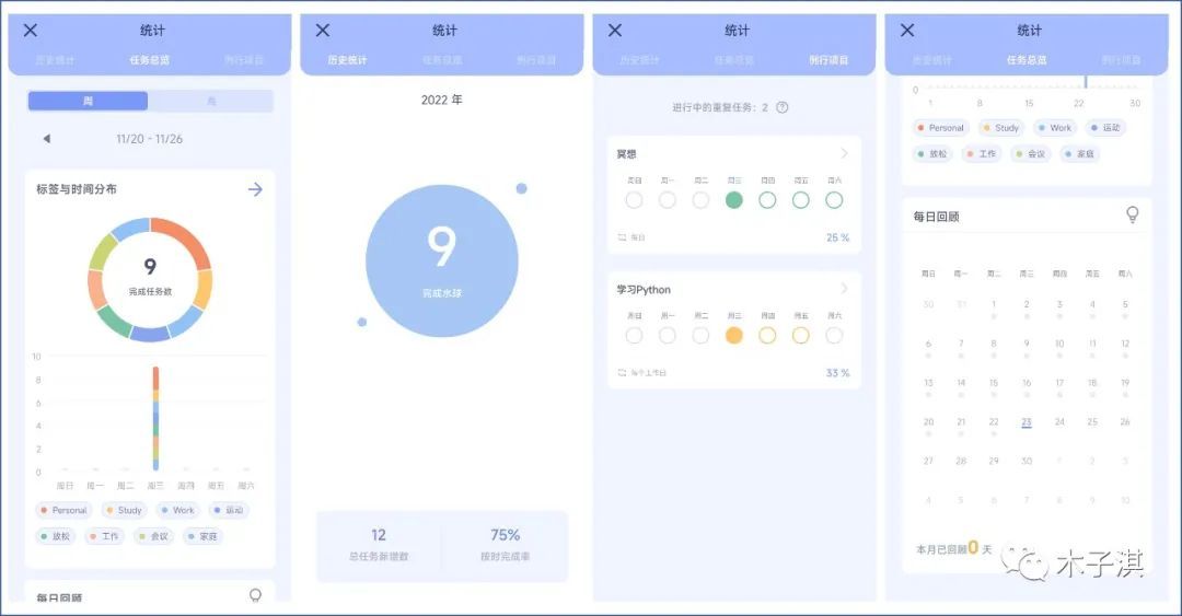 它支持强大的统计功能,包括:历史统计、任务总览、例行项目,历史统计包括:完成水球数量、总任务新增数、按时完成率。