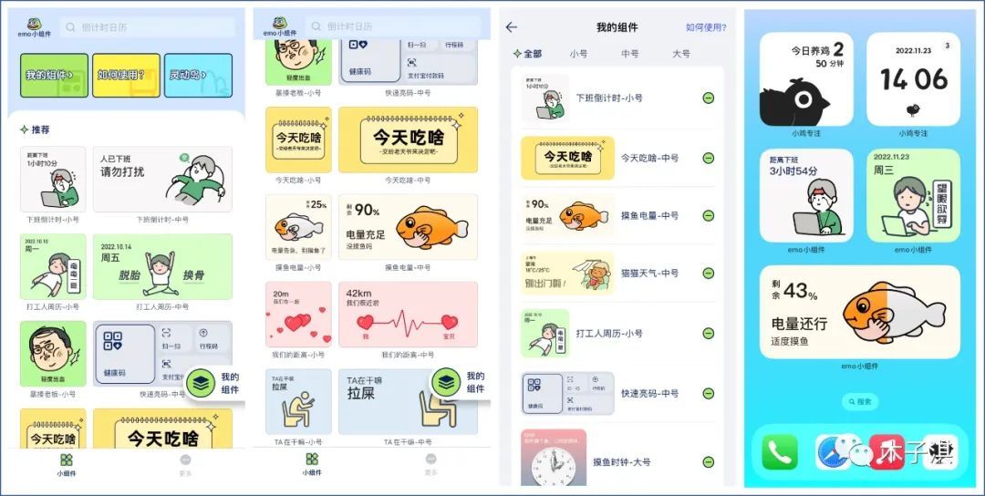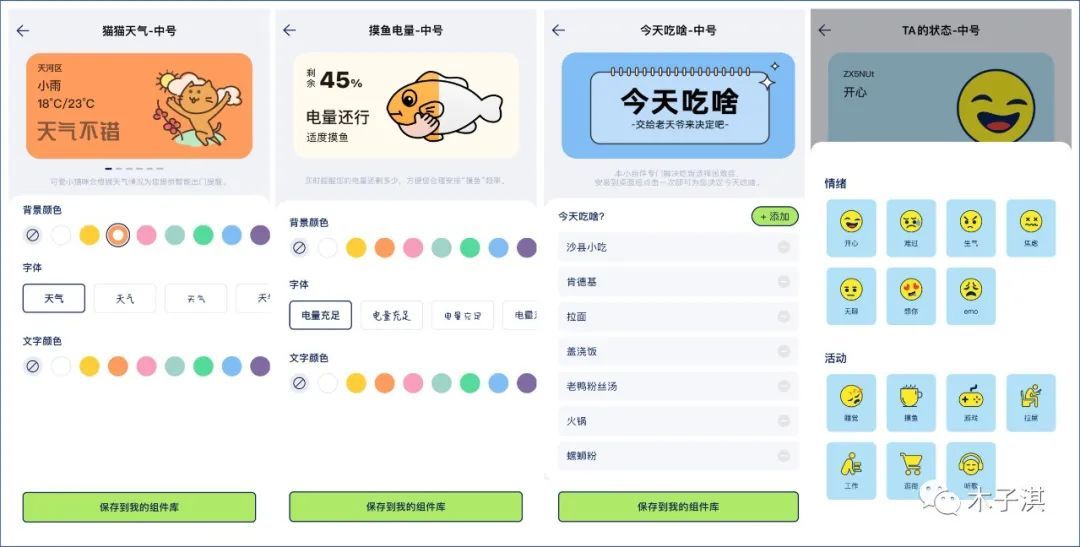 它目前支持 10 多种桌面小组件,包括:摸鱼时钟、今天吃啥、摸鱼电量、打工人周历、下班倒计时、猫猫天气,还有情侣互动主题,包括:我们的距离小组件、心情状态小组件、好友大头贴小组件。