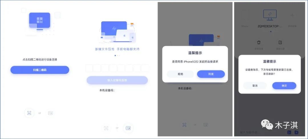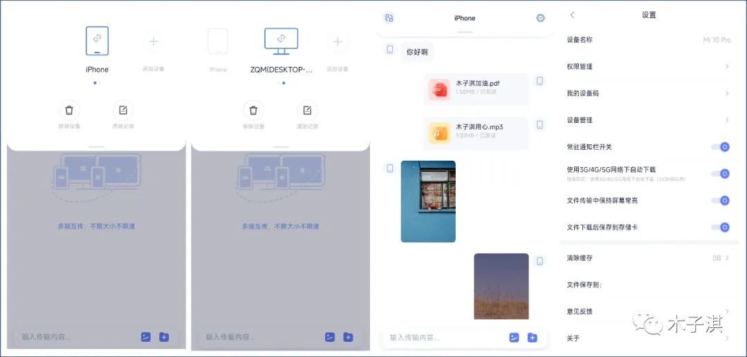 它没有传输文件大小的限制,也没有传输文件数量的限制,一个设备可以连接多个设备,例如一台安卓手机可以连接一台电脑、一台苹果手机、一台安卓手机等,支持左右切换连接的设备,支持移除设备,支持清除记录。