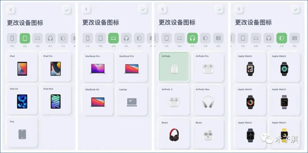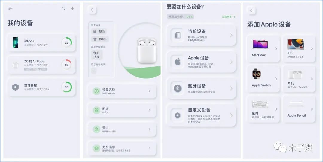 它支持添加 Apple 设备、蓝牙设备、自定义设备、当前设备,支持追踪你的苹果设备的电量,包括:iPhone 、iPad 、AirPods 、Apple Watch 、MacBook 、Apple Pencil 以及妙控配件,还支持追踪多种与 Apple 兼容的耳机。