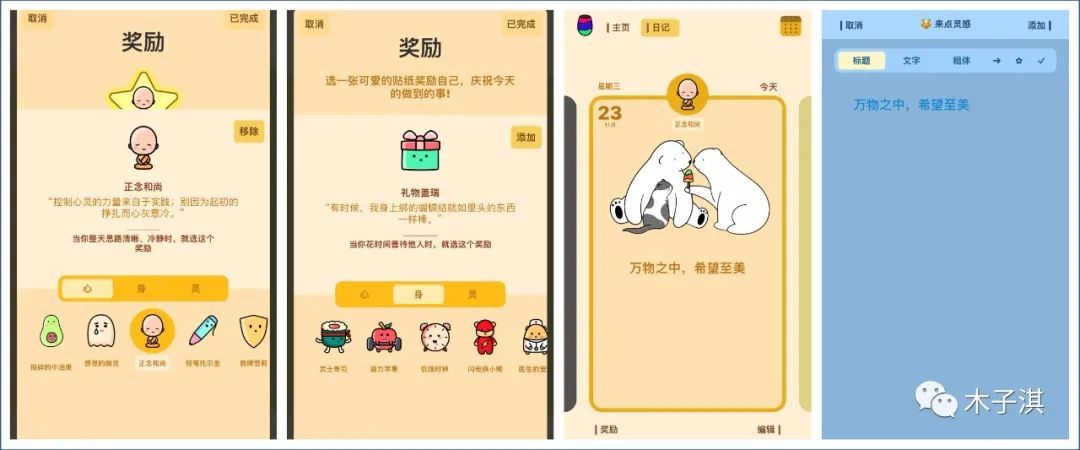 它支持奖励按钮,可以选一张可爱的贴纸奖励自己,庆祝今天做到的事情,添加贴纸之后,贴纸会展示在卡片的顶部。