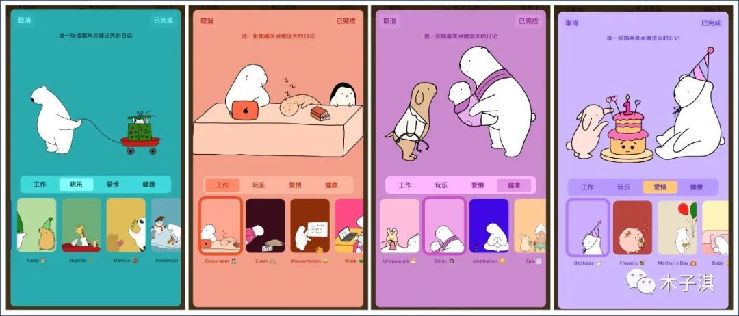 编辑完成,可以选一张插画来点缀这天的日记,插画分类包括:工作、玩乐、爱情和健康。