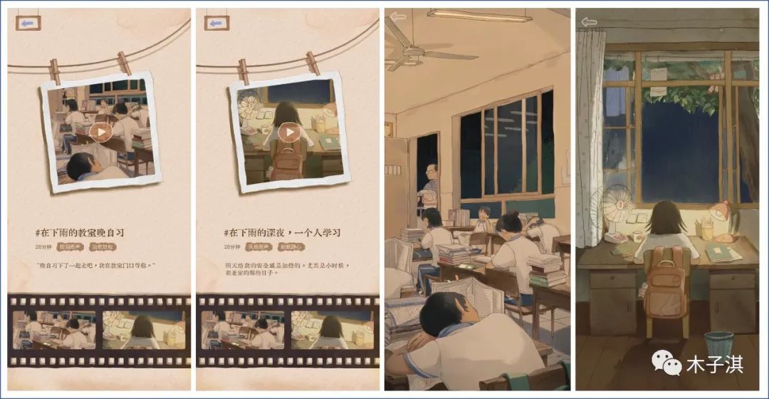 它支持时光板块,目前支持 2 个场景和时光,分别是在下雨的教室晚自习、在下雨的深夜一个人学习。