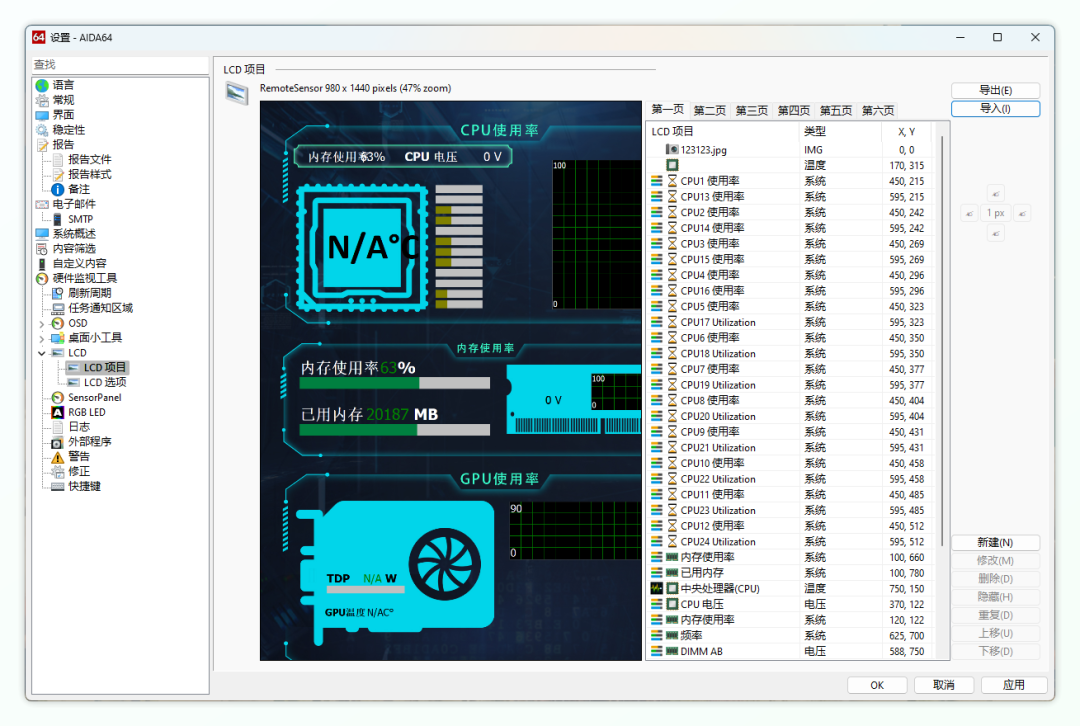 1.然后打开「AIDA64」软件,点击:菜单 – 文件 – 设置 – LCD – 设置你手机的分辨率 – 启用 RemoteSensor LCD 支持。