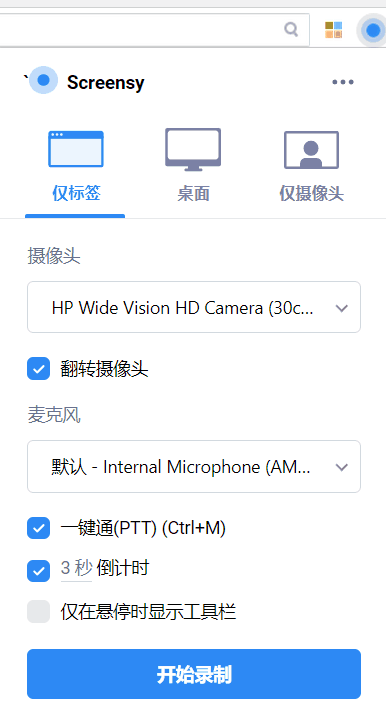 安装 Screenity 之后,点击绿色的插件图标按钮启动插件,可以看到一共有三种录屏模式,「仅标签」也就是只录制当前浏览器标签页,「桌面」则是录制整个桌面所有内容,「仅摄像机」就比较好理解了,就是调用电脑摄像头录制单一的摄像头内容。