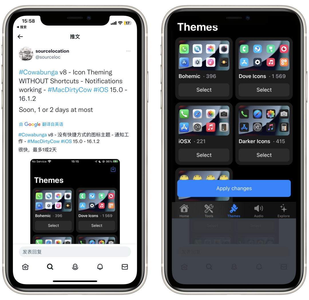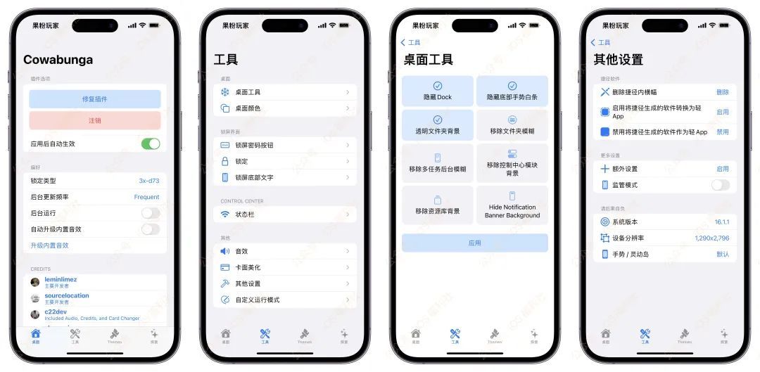 大佬@sourceloc 预告了它的多功能工具箱Cowabunga,将支持主题美化功能,还强调了并不是那种书签形式的,是真正的主题图标,并附上了几张主题的截图,今天正式发布了Cowabunga 8.0.1 正式版,喜欢美化的小伙伴们开心了!