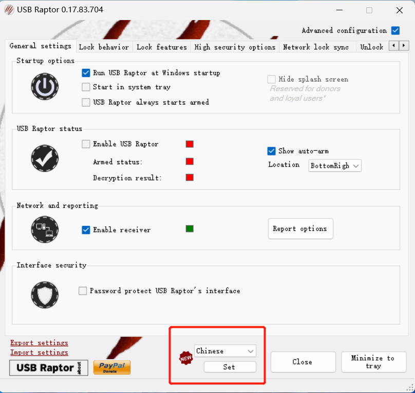 首次运行 USB_Raptor ,软件默认语言是英文,需要在最底端语言下拉列表中选择「Chinese」并点击「Set」按钮。
