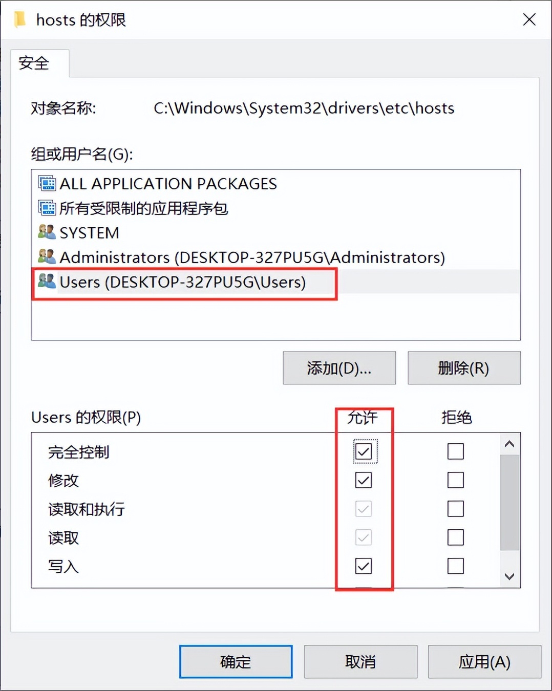 这里可以先操作设置hosts文件保存权限,右键hosts文件-属性-安全,然后修改当前电脑登录账户的权限为完全控制,方便后面进行直接修改保存。