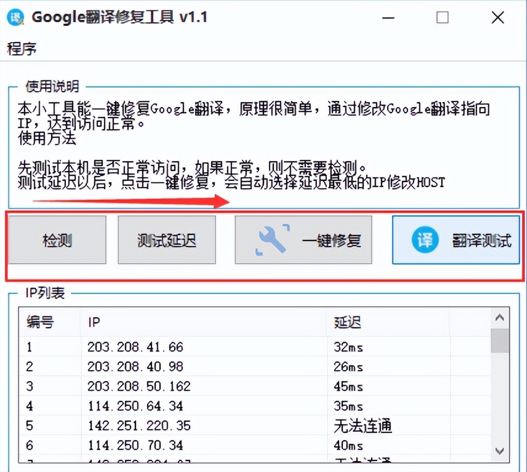 打开软件后会自动获取可用的谷歌翻译IP,先「点击检测」测试本机是否正常访问,如果正常,则不需要检测。再点击「测试延迟」以后,点击「一键修复」,会自动选择延迟最低的IP修改HOST,设置完成以后,可用「翻译测试」一下翻译接口是否正常。