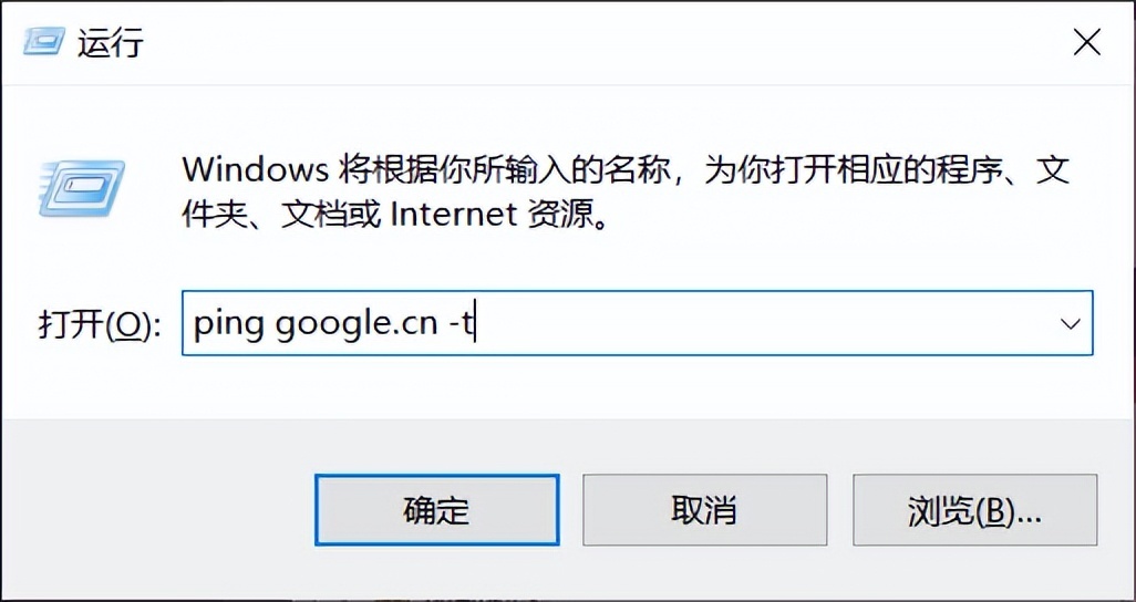 谷歌在国内有很多服务器,我们要找到离自己最近的谷歌服务器IP,可以通过ping的方法,这个方法是最简单的,按win键+R,然后输入ping google.cn -t,按确定。