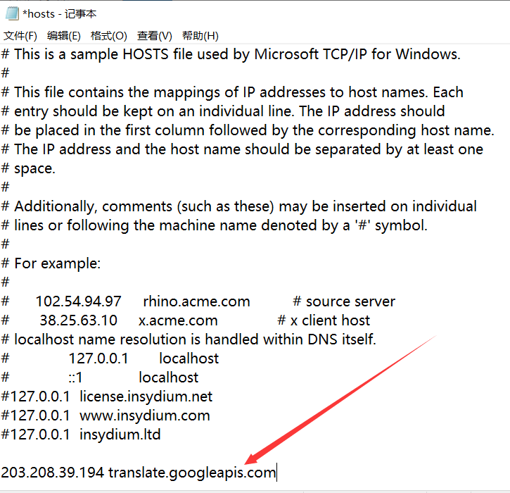 上面找到了hotst所在的地址,用记事本打开hosts文件,把“地址+空格+translate.googleapis.com”输入在最后面。