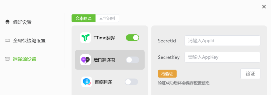 打开后,会让你填写翻译接口的ID与密钥,大家也不用担心,这个是可以免费得到的。