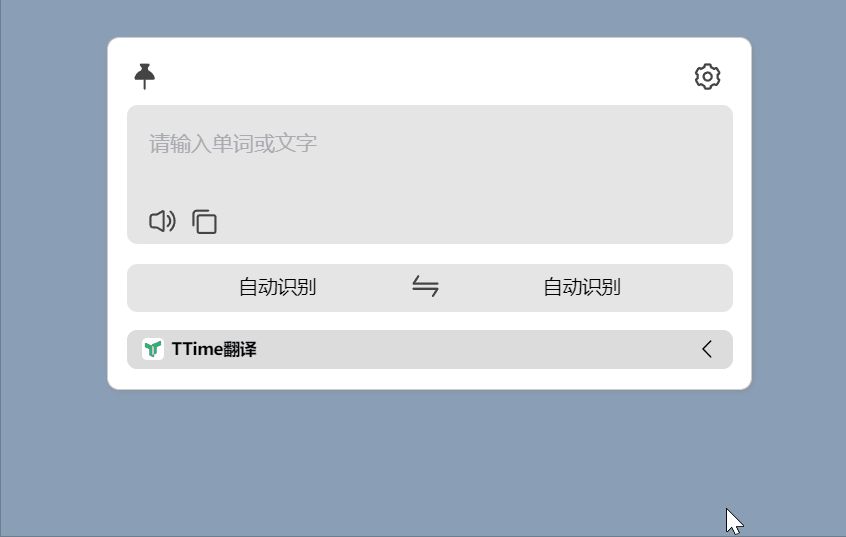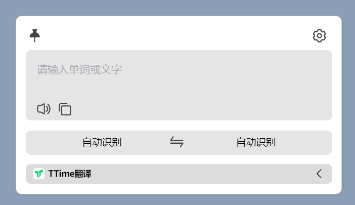 软件主界面如下,目前看上去还是挺简洁的,有一个窗口置顶与发音的按钮,以及一个复制的按钮——没有粘贴按钮是因为有划词翻译功能,不用自己手动粘贴。