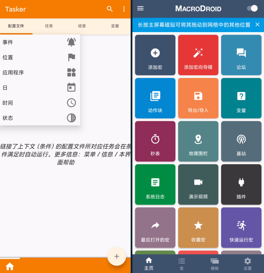 而Macrodroid就可以当作是Tasker的升级版,界面上也美观一点,对比一下首页。